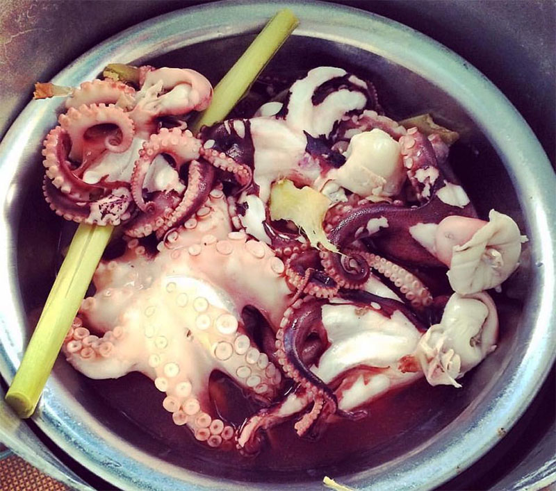 - Bạch tuộc làm sạch sơ chế, chần qua nước sôi 1,2 phút.